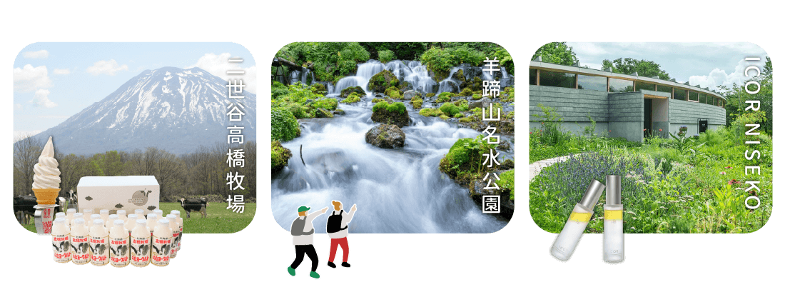 ▲高橋牧場、名水公園、ICOR NISEKO依照導遊適當安排三組景點擇二前往。 若當日氣候與時間許可,三組景點都會前往參觀。