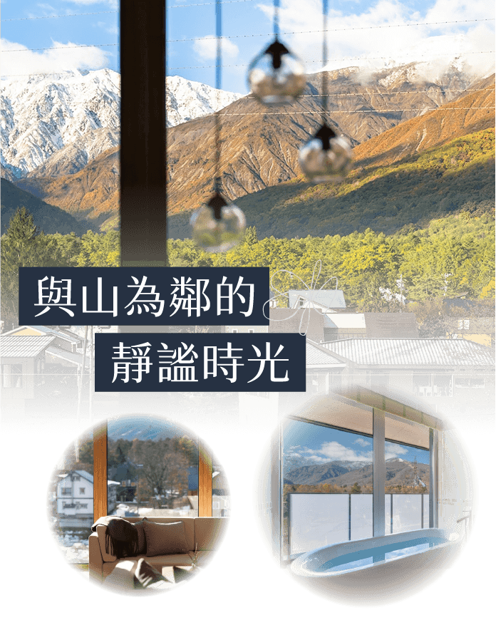 窗外即是壯麗的北阿爾卑斯群峰。四季景色各具風情,無論是夏日翠綠山景或秋季山林色彩,都能在靜謐氛圍中感受大自然的純粹與寧靜。