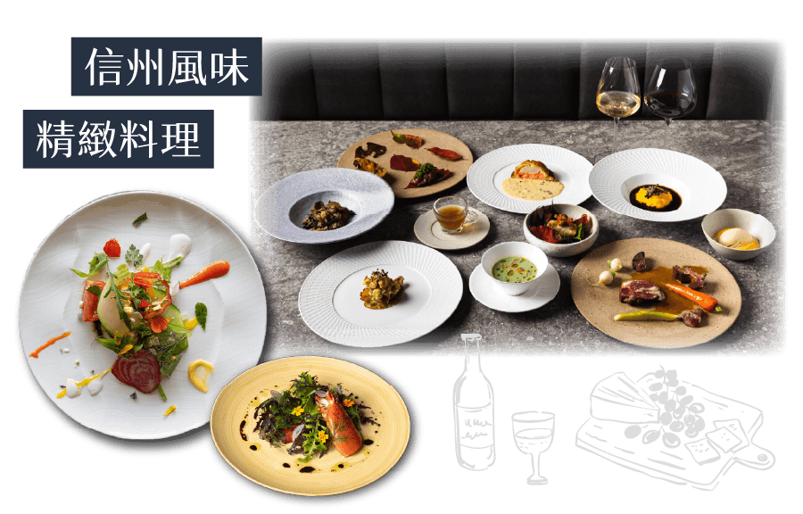 飯店餐點以信州與周邊地區的旬味食材為主,從前菜、主菜到甜點皆呈現精緻細膩的日式料理風格。主廚以自然與季節為靈感,打造層次豐富的餐桌體驗,讓旅客透過味覺感受土地的溫度。