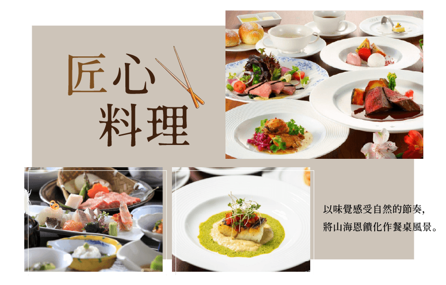 早餐:飯店內、午餐:阿蘇精緻陶板燒套餐、晚餐:飯店內享用西式創作料理